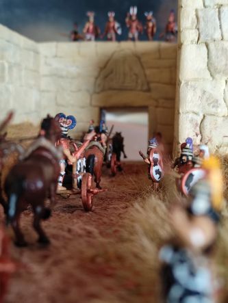 La maquette : La maquette : La porte des lions : rassemblement des rois grecs sous le commandement d’Agamemnon, Roi de Mycènes, commandant des achéens avec Achille, chef des myrmidons.