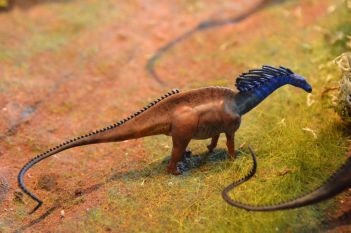 La maquette : Un ensemble de dinosaures paisibles sont alarmés par la présence de deux carnivores. (Figurines réalisées à l’imprimante 3D)